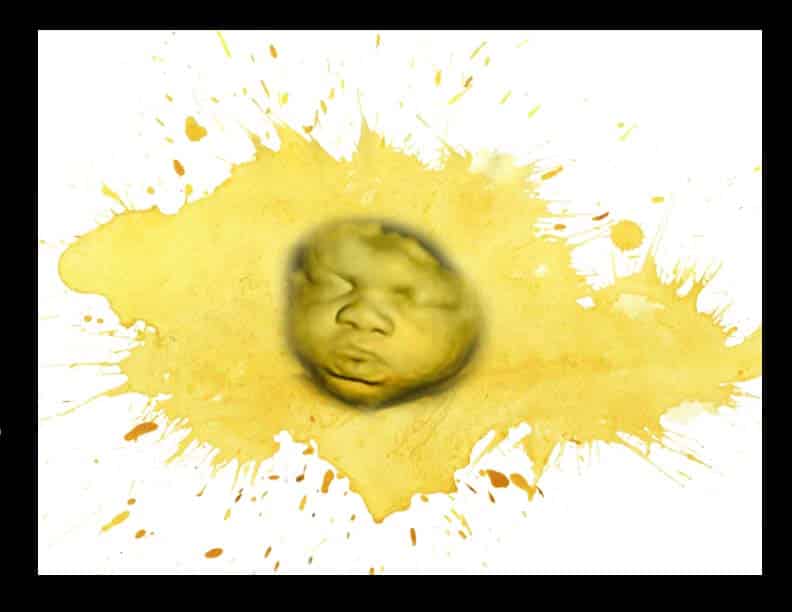 Beautiful baby’s angelic face sleeping in womb in a sun-colored yellow water color.